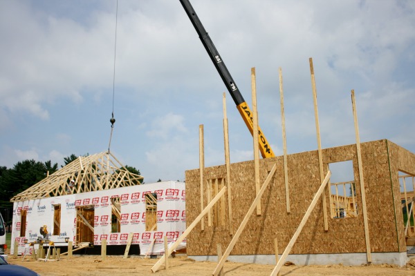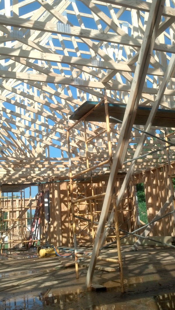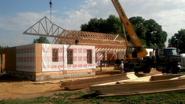 Most importantly, this week we got a crane and they started putting up the trusses for the roof.