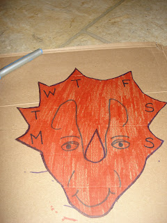 I cut out the shape and traced it onto the back side of the box and cut it out. Then I sketched in a face based on the coloring book pages I found online (just Google “dinosaur coloring pages”)