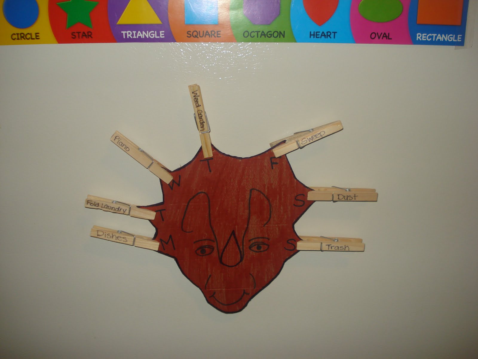 I wrote different chores onto clothes pins and clipped one onto each spike. In theory that will be one chore that Nicholas would be responsible for doing on that day of the week.