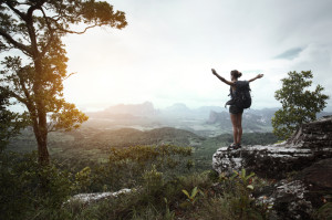 Young hiker with backpack standing with raised hands on a cliff’s edge and looking over wild tropical valley
