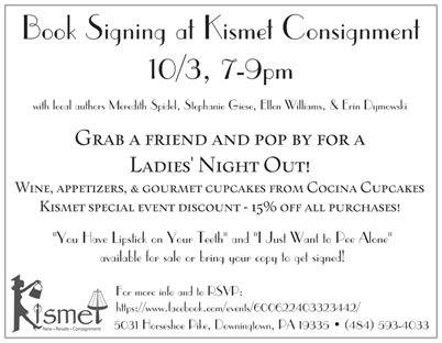 First, on October 3rd, I’ll be joining Meredith from The Mom of the Year and Ellen and Erin from Sisterhood of the Sensible Moms in Downingtown, PA at Kismet Consignment for an amazing book signing/LNO. Can you say free wine, lipstick, and cupcakes? We can!