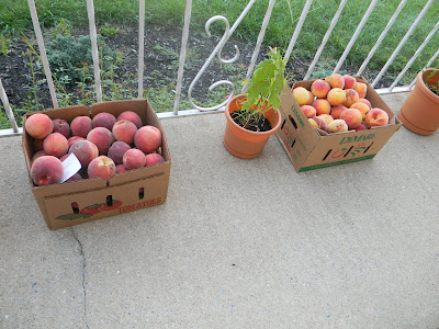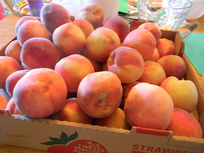 Yesterday I took the kids to Brown’s, my favorite local orchard, and bought a box of peach seconds. (Seconds are bruised or over-ripe fruit that they sell you at a large discount. They are great for canning.) Then I got home and saw that another orchard was having a great one-day sale on their seconds as well. My friend Korie kindly picked some up for our family while I was at my ultra sound appointment.