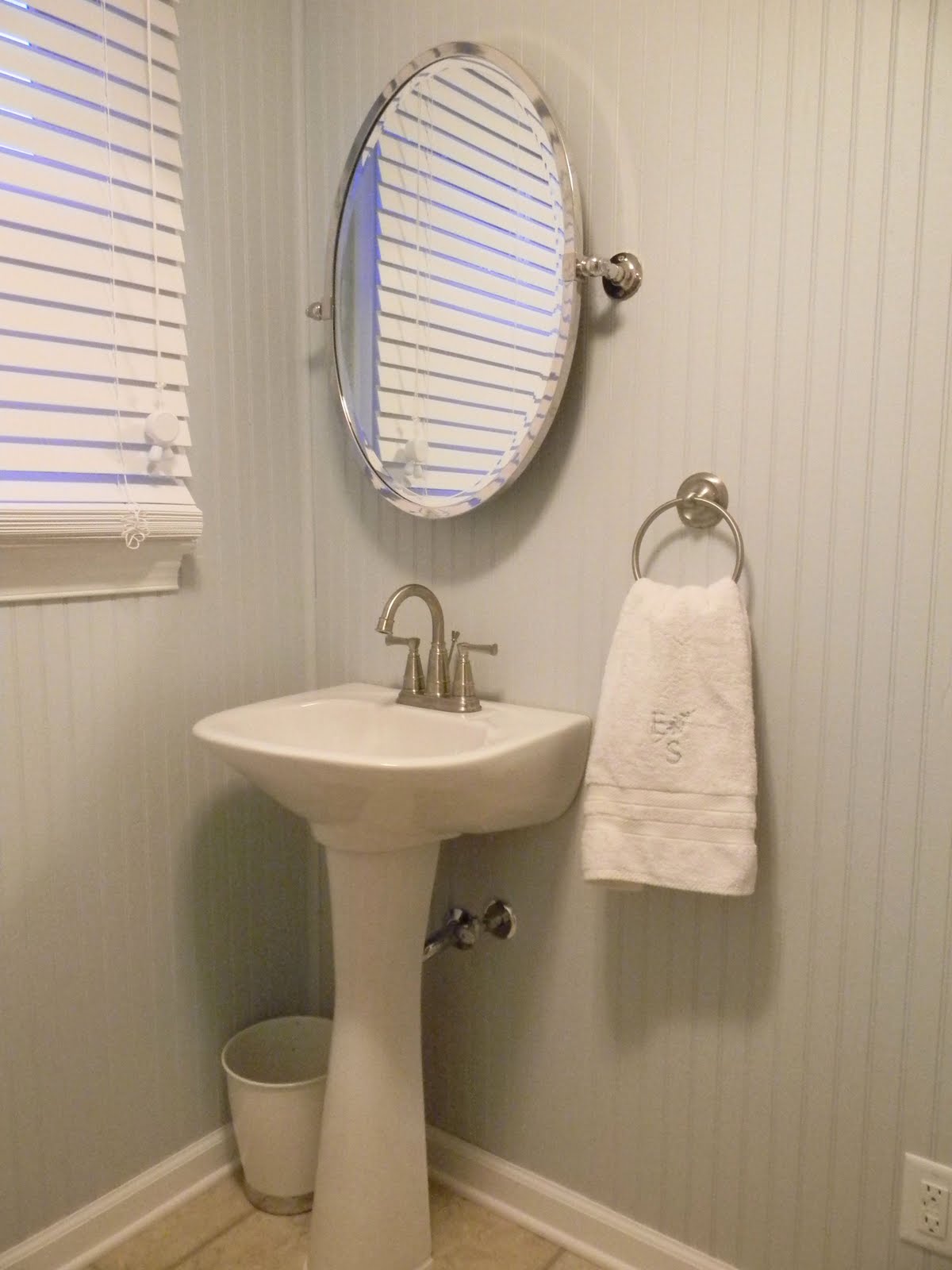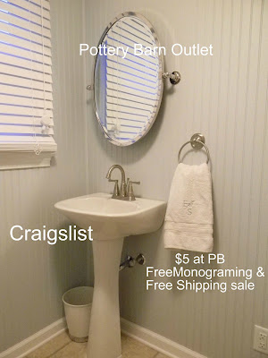 So my job was to find affordable ways to make it look pretty. This little corner showcases some of my best deals. The pedestal sink was $30 on Craigslist. The mirror was $49 at the Pottery Barn outlet. (That’s $200 off retail because it was missing one washer. We were easily able to find a replacement at Lowes for about $2.) And the towels I bought for $5 each last year when Pottery Barn had a free monogramming/free shipping sale after Christmas.