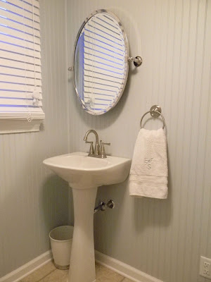 Everybody gave me a hard time about taking the bead board all the way to the ceiling, but we didn’t really have much of a choice because behind the original paneling every wall was a different material. Plaster, cinder block, you name it. If we’d tried to frame out drywall against the cinder block, we would have needed to relocate the plumbing for the toilet and that’s not something within hubby’s skill set, so it would have gotten really expensive really fast. Plus, I had seen Gina do it, so I knew it would look nice. Eddie’s not thrilled that the bead board is just attached to the cinder block with liquid nails on the wall behind the toilet. He calls shortcuts like that “putting lipstick on a pig.” I call it good enough.