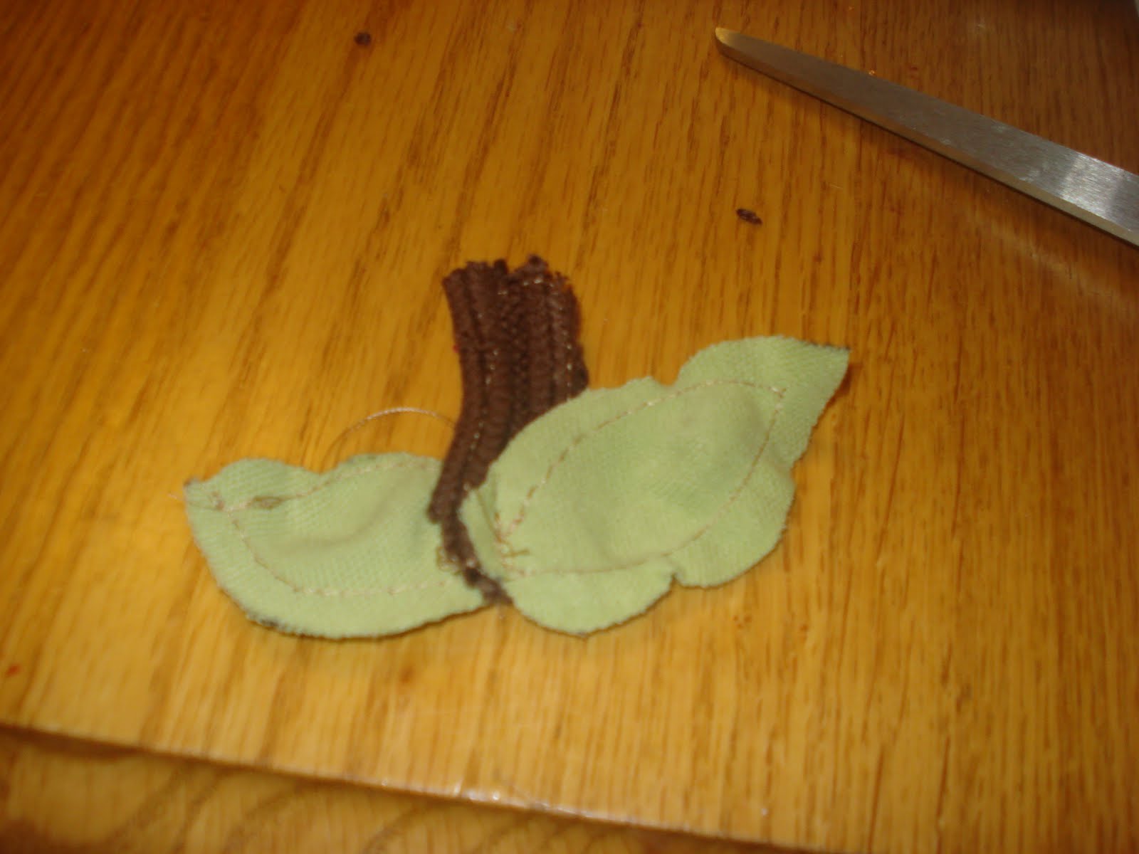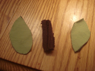 Cut two pieces of green fabric (I used an old tee shirt) into the shape of leaves and a piece of brown fabric (I used a sweater) into a small rectangle.