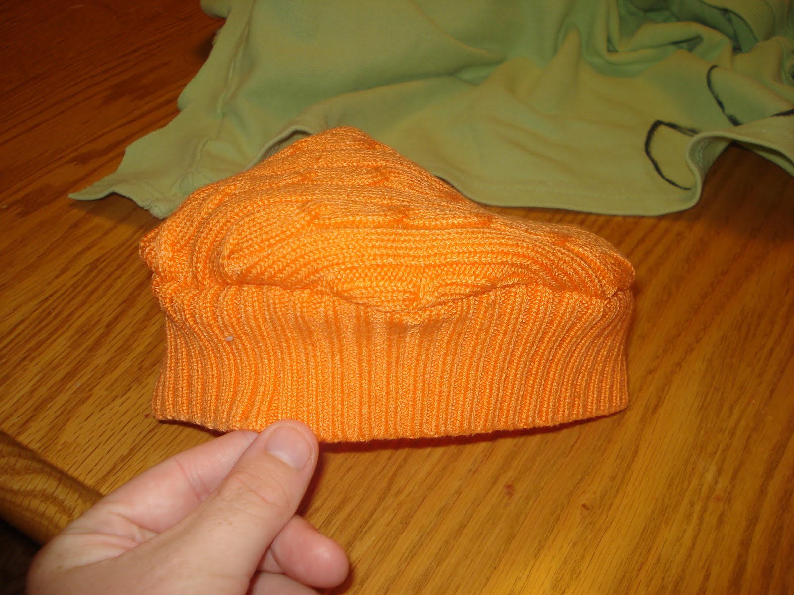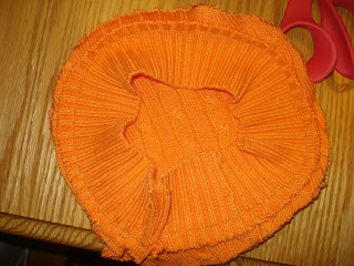 Now turn the hat right-side-out. There you have your basic sweater hat (the same one from my earlier tutorial), but we want to turn this one into a pumpkin.