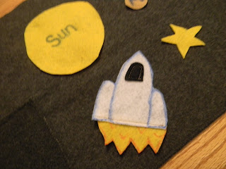 Next cut space-related shapes out of your felt & use a fabric marker to embellish them. I made a rocket ship, a few stars, all of the planets, and the sun. I labeled the sun and labeled each planet with the first letter if its name.