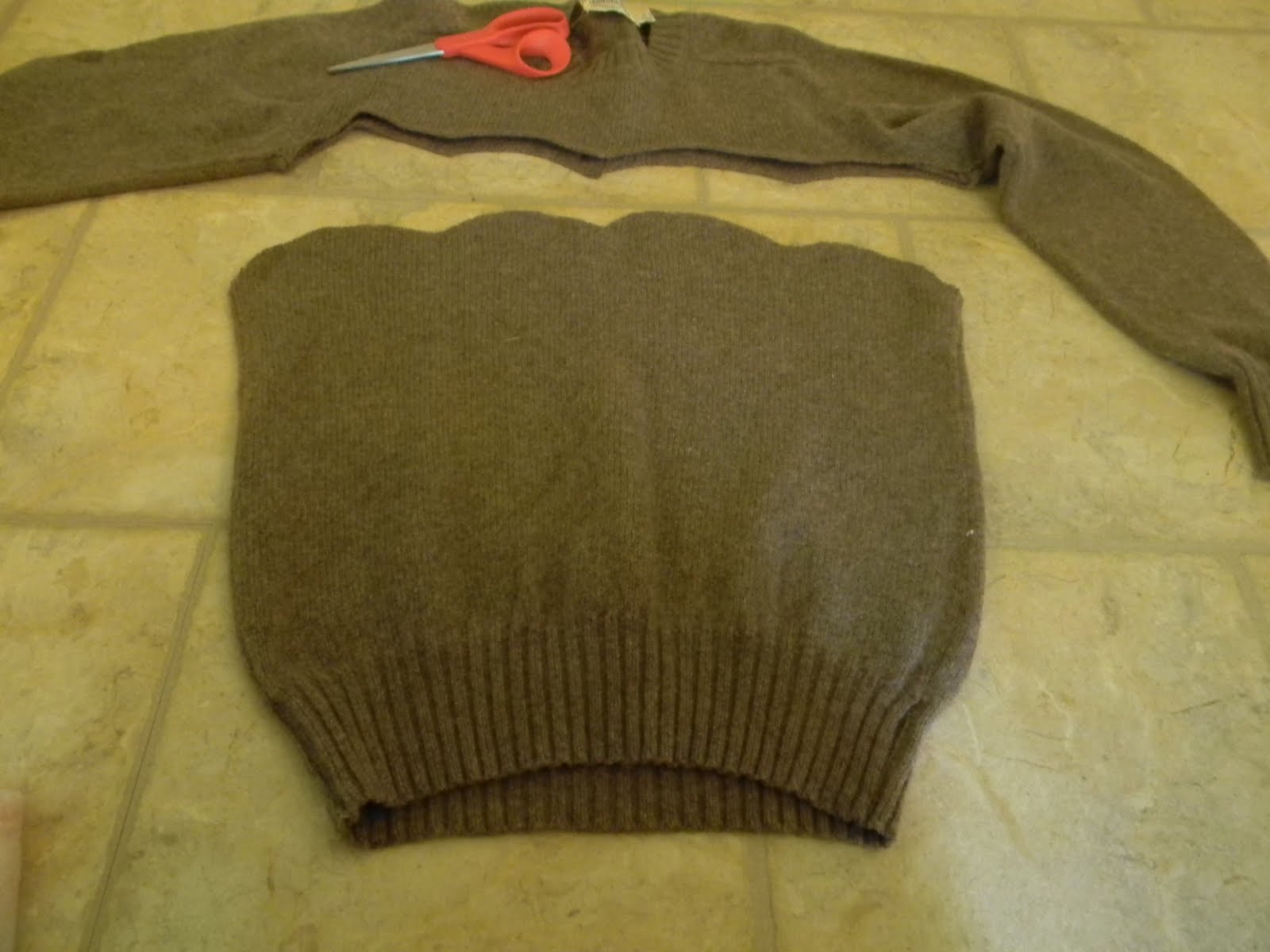 The important thing is to find a sweater with a band at the bottom that is similar to your waist measurement. (A little bit smaller is better because it will stretch. If it’s a little big just belt it.) This one is a men’s medium and I picked it up at Goodwill today for $4. It’s important to use a men’s sweater because it gives you more fabric for length.