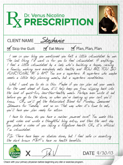 What I want you to do is this. Maybe if you can plan out your meals for the week ahead of time, it’ll help keep you from slipping back into the land of quick-fix, less-than-healthy meals. Perhaps even write it out before you go to the store, so when you’re loading up your cart you’ll know, “OK, we’ll get the Antioxidant Blend for Monday, Seasoned Steamers for Tuesday” and so on. That way when it’s time to eat, you’ll have your plan ready for action.