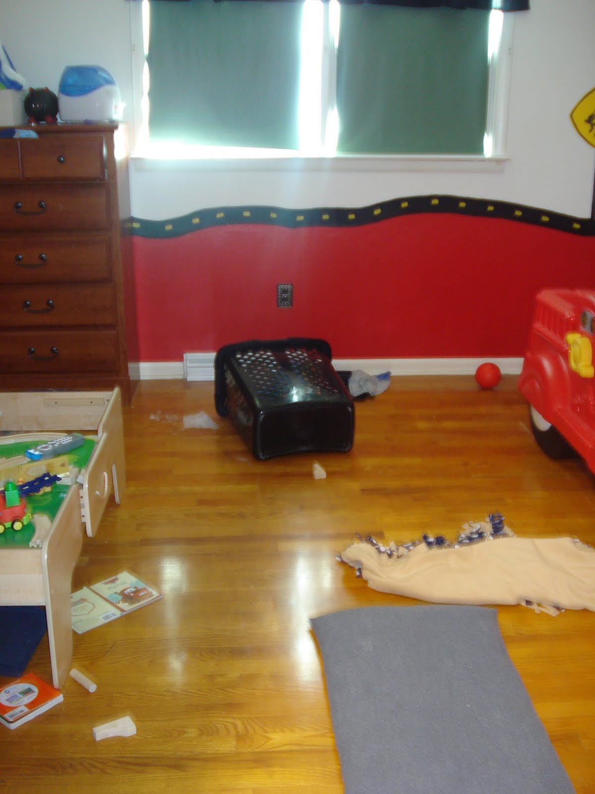 This morning started out by discovering that he had scaled the baby gate that is supposed to keep him contained in his room at night (because he doesn’t sleep well and it is not unusual to find him playing with toy trains or doing belly flops from his headboard onto the mattress in the middle of the night). He was in the bathroom scattering his bath toys everywhere. Thankfully he hadn’t found anything too dangerous. This is my biggest concern because that is by far the most dangerous room in our house for him.