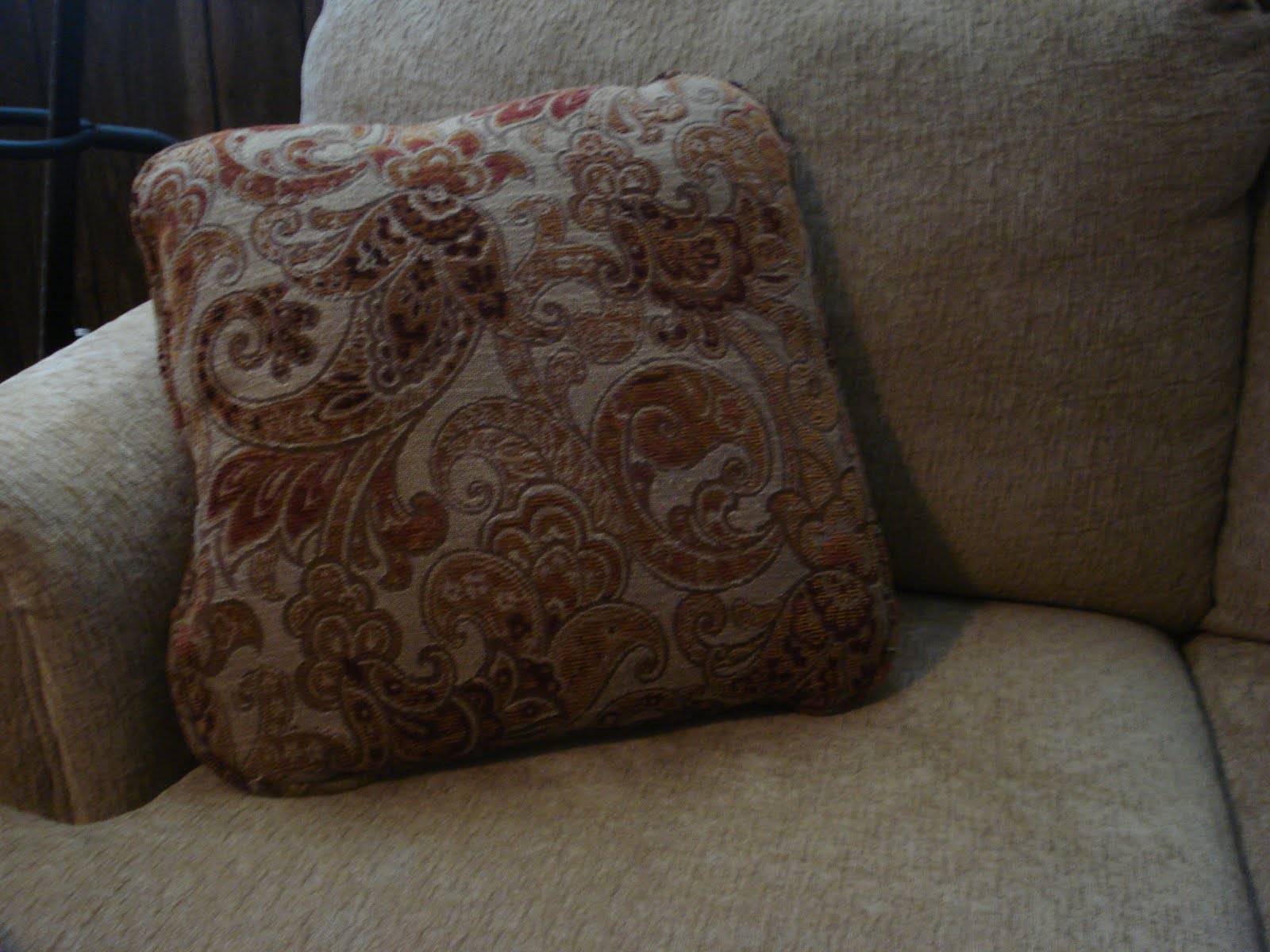 Then I took one of these hideous pillows that came with the love seat we have in our basement, stuck it inside & sewed up the last end. If you wanted to get creative you could make some kind of button closure, but I’m cheap, excuse me, frugal, and impatient, so I did it the easy way.